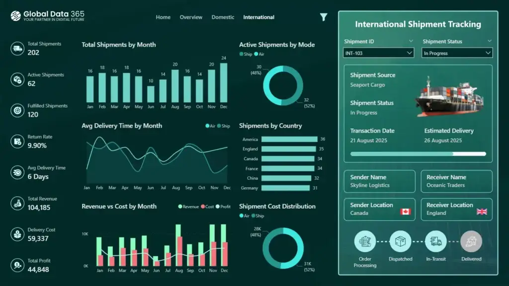 It highlights total, active, and fulfilled shipments, with KPIs such as return rate, average delivery time, total revenue and delivery cost. With visual insights into monthly shipment trends, delivery time analysis, revenue vs. cost comparison and shipment breakdown by city and transport mode. The shipment tracking card displays detailed delivery progress, from order processing to dispatch and in-transit status, ensuring complete visibility and control across every local shipment, this dashboard helps logistics teams evaluate domestic efficiency.