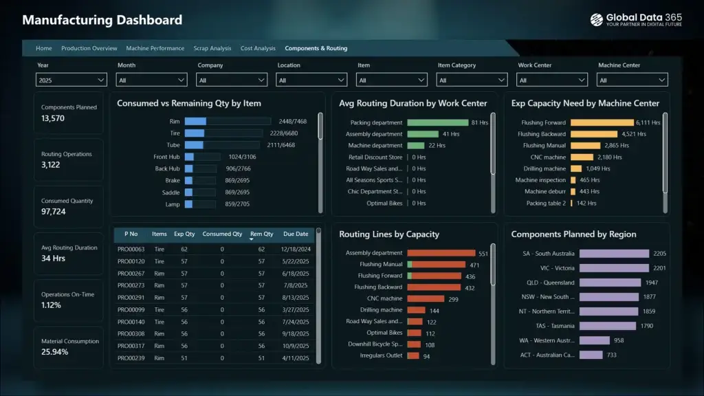 The Components & Routing Dashboard page provides a comprehensive view of material consumption and production routing efficiency.