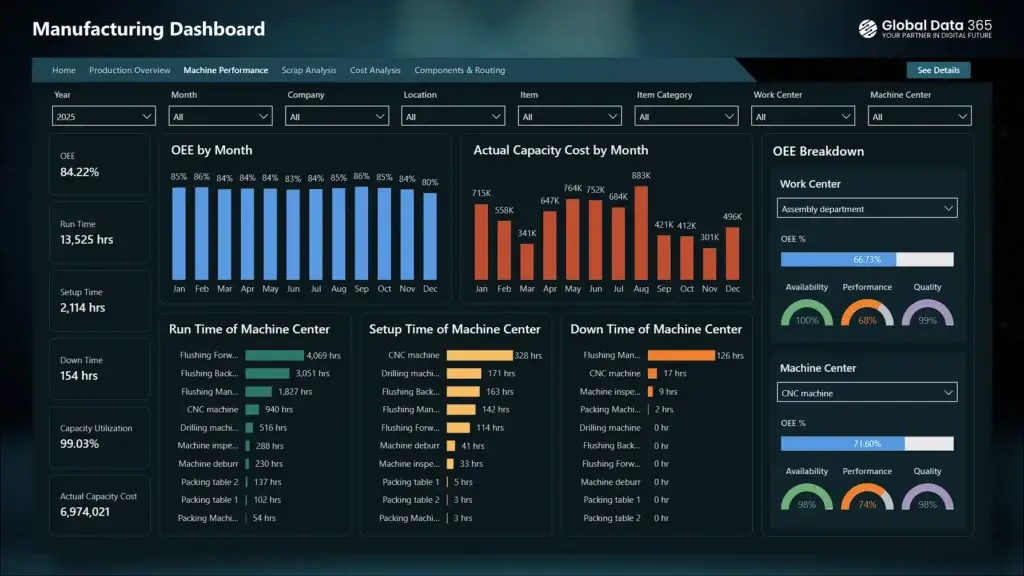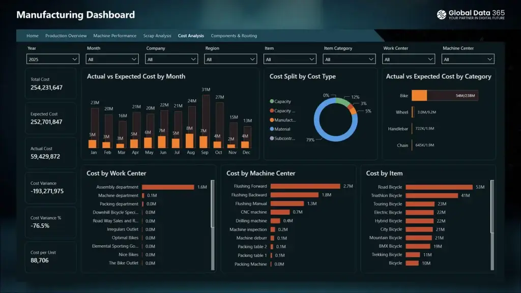 It highlights total cost, expected vs actual cost, cost variance, and cost per unit to track financial efficiency. With visual insights into monthly cost trends, cost distribution by type, and detailed cost breakdown by work center, machine center and item category, this manufacturing cost dashboard is an essential tool for identifying cost drivers and improving overall profitability.